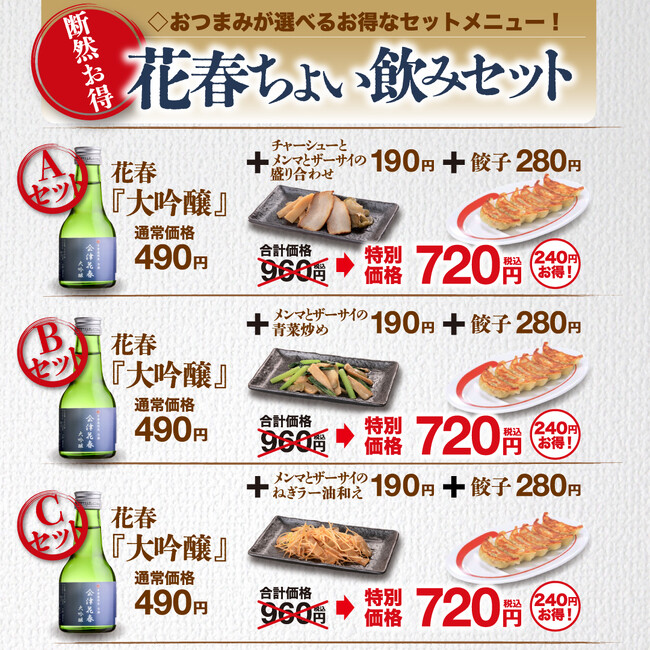 会津花春〈大吟醸〉の新しいセットが仲間入り!幸楽苑のおつまみが選べる断然お得な「花春ちょい飲みセッ…