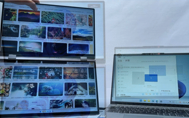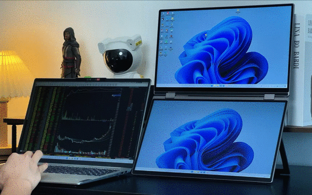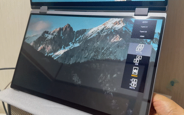 上の画面はワンプッシュで回転可能。用途や視点に合わせて自由自在に調整できます。プレゼンテーションや共同作業、動画視聴など、あらゆるシーンで快適な視聴環境を実現します。