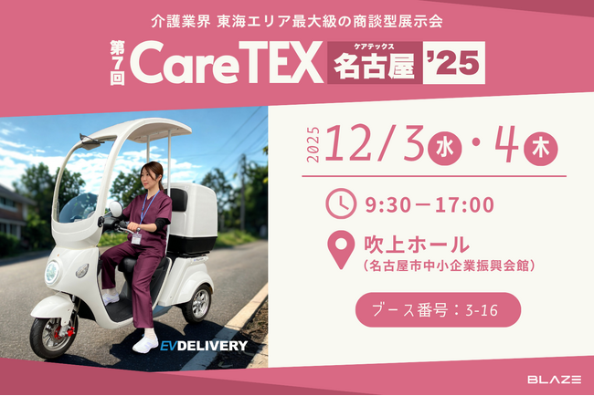 株式会社ブレイズ(愛知県名古屋市、代表取締役:市川秀幸、以下ブレイズ)は、2025年12月3日(水)・4日(木)に愛知県名古屋市にある吹上ホールで開催される介護業界 東海エリア最大級の商談型展示会「第7回 CareTEX名古屋’25」に、ブレイズの3輪屋根付き電動スクーター「EVデリバリー」が出展することをお知らせします。