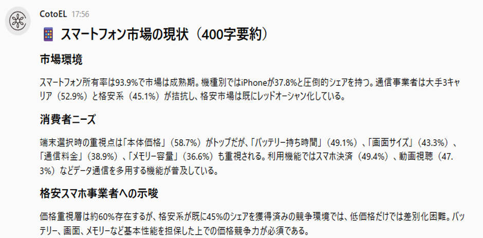 ●分析結果 1.スマートフォン市場の現状AI分析サービス「CotoEL」が調査データをもとにスマートフォン市場の現状を分析し、その結果を400字程度に要約した本文です。