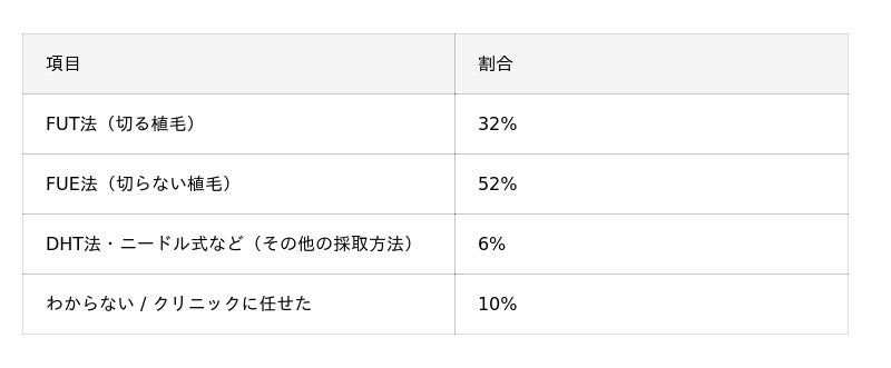 自毛植毛では、「FUE法(切開を伴わない植毛)」を選んだ人が全体の半数を超えました。