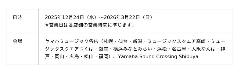 期間:2025年12月24日(水)~2026年3月22日(日) 会場:ヤマハミュージック拠点15か所、Yamaha Sound Crossing Shibuya