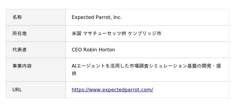 同社は、Airbnb社やStripe社等を輩出した世界屈指のスタートアップアクセラレーター「Y Combinator」の最新バッチ(Fall 2025)採択企業です。Expected Parrotの創業メンバーには、MITスローン経営大学院の終身教授であり、AIと経済学の分野において高い研究実績を有する John Horton 氏(CTO)が参画しており、同氏はAnthropic社などの主要AI企業における経済分野のアドバイザリーにも関与しています。また、Robin Horton 氏(CEO)は、Uber社の法務データ部門における実務経験を通じて、厳格なデータ管理と規制対応への深い知見を有しています。同氏は、AI活用時のハルシネーション(誤回答)リスクを懸念するコンプライアンスを重視する顧客に対し、適切なリスク管理と検証プロセスを組み込んだ事業基盤の構築を主導しています。