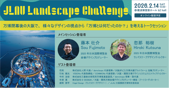 [画像1: https://prcdn.freetls.fastly.net/release_image/175221/6/175221-6-1b0da883d2c2ec5af2bc3f25bcdea2b1-3900x2040.png?width=536&quality=85%2C75&format=jpeg&auto=webp&fit=bounds&bg-color=fff ]【JLAU Landscape Challenge】第一弾は、万博ゆかりの方々をお招きしトークセッション・セミナーを開催いたします