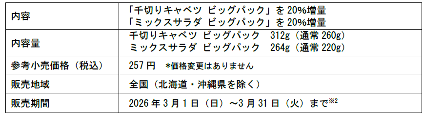 株式会社サラダクラブ(代表取締役社長:新谷昭人、本社:東京都調布市)は、2026年3月1日(日)~3月31日(火)までの期間限定※1で、「千切りキャベツ ビッグパック」「ミックスサラダ ビッグパック」を価格据え置きのまま20%増量して全国(北海道・沖縄県を除く)で販売します。