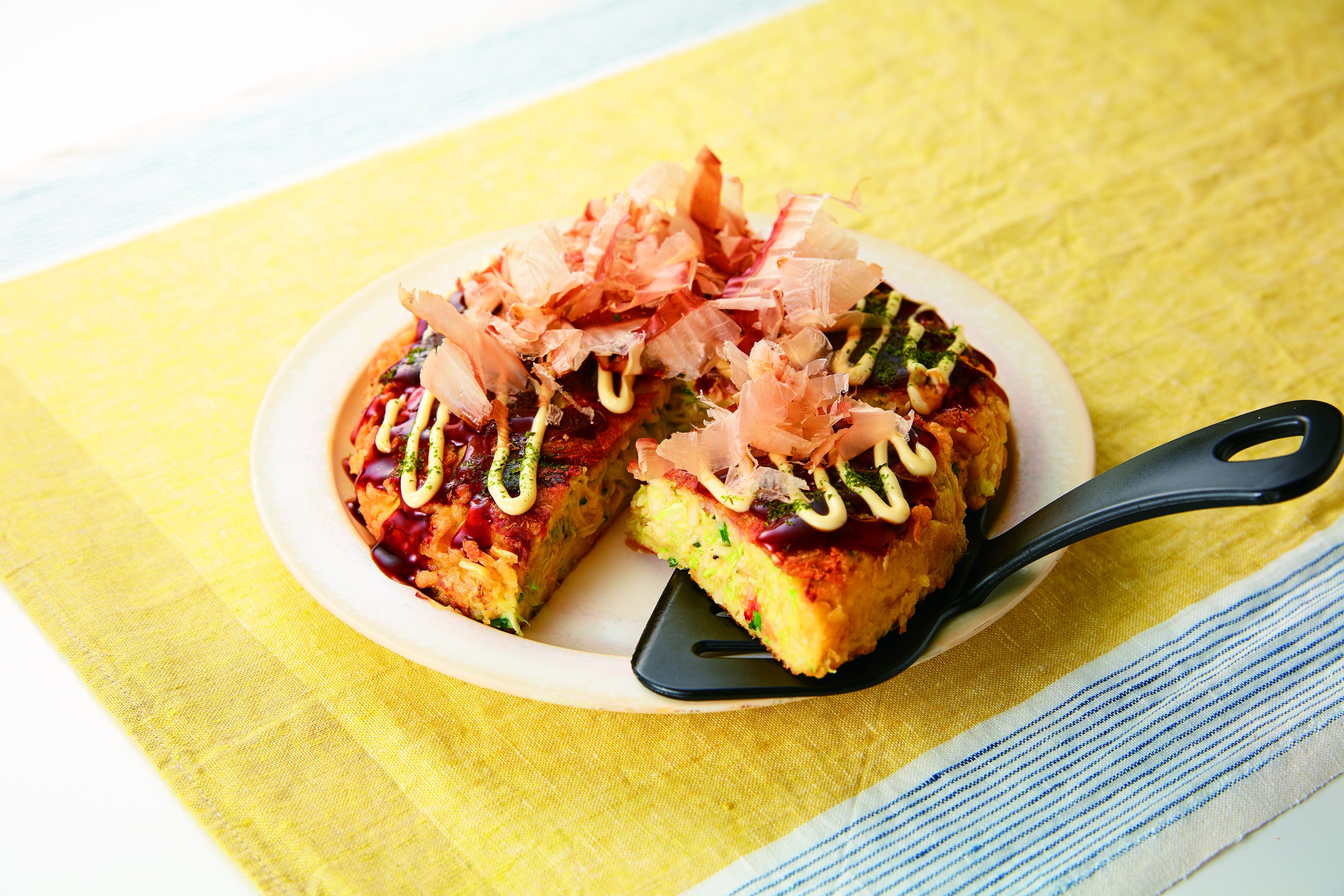 4. お皿にのせ、お好み焼きソース、キユーピー マヨネーズをかけ、青のり、花かつおをのせて完成!