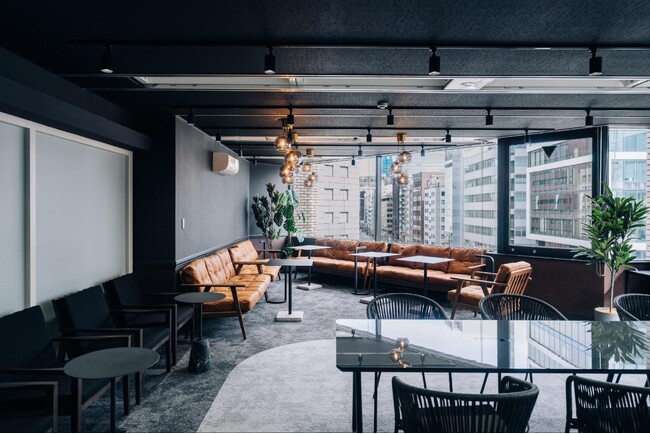 入居者のみ利用可能なラウンジをご用意しています。ダークトーンで統一された“SpeakEasy(潜り酒場)”のような雰囲気が特徴的です。執務エリアとは一線を画すこの空間は、企業の大切な仲間と集い、新たなメンバーを迎え入れ、そして大切なお客様をもてなすための、特別な場として設計されています。大きな窓からは、大通りを眼下にのぞむ開放感のある景色が広がります。
