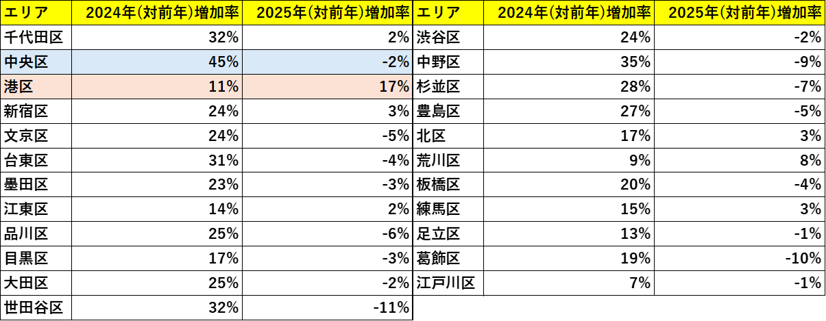 次に、再販マンションの増加率をエリア別に見ていくと、東京23区の中でも異なる動きが見えてきます。
