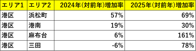 特に港区の中でも「浜松町」「港南」「麻布台」「三田」といったエリアでは、2025年に再販マンションの供給が大きく増加しました。