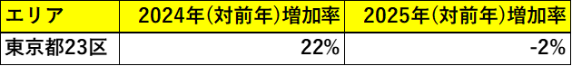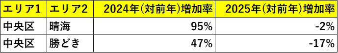 しかし2025年になると状況は一転し、再販マンション増加率は前年比マイナス2%となりました。特に「晴海」「勝どき」といった湾岸エリアでは、再販投資が急速に減速する動きが見られています。
