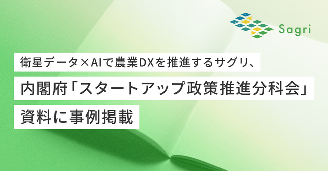 衛星データとAIを活用し、農業と環境の課題解決を目指すサグリ株式会社(本社:兵庫県丹波市、代表取締役:坪井 俊輔、以下「当社」)は、内閣府が公表した「第2回スタートアップ政策推進分科会 説明資料」の資料において、当社の取り組みが事例として紹介されましたことをお知らせいたします。