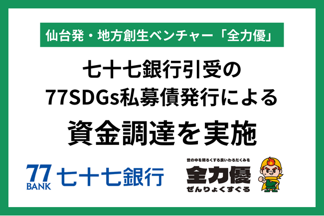 仙台発・地方創生ベンチャー「全力優」、七十七銀行引受の77SDGs私募債発行による資金調達を実施