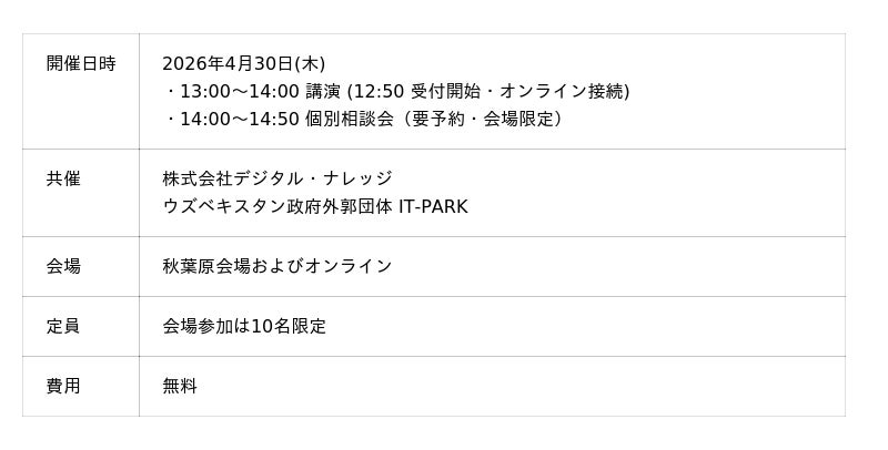 導入実績3,000超のeラーニング専門ソリューション企業、株式会社デジタル・ナレッジ(本社:東京都台東区、代表取締役社長:はが弘明)は、 2026年4月30日(木)、ウズベキスタン共和国デジタル技術省の外郭団体「IT-PARK」より招聘講演者を迎え、共催セミナー「『ウズベキスタン&IT』の最新事情と実践のススメ ~いま始められるIT事業展開の新たな選択肢~」を開催いたします。