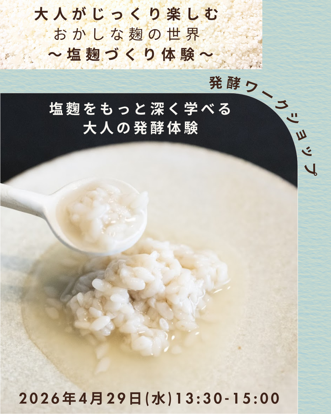 [画像6: https://prcdn.freetls.fastly.net/release_image/59888/59/59888-59-a5e641a55c7a6dd5ffd501d71cb5a907-1080x1350.png?width=536&quality=85%2C75&format=jpeg&auto=webp&fit=bounds&bg-color=fff ]4月29日大人がじっくり楽しむ!塩麹づくり体験あなたもおかしな麹の世界を旅してみませんか?