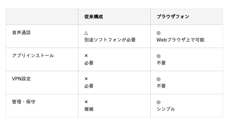なお、従来必須だったVPN経由の接続は、通信の遅延や障害発生の原因になることがありましたが、ブラウザフォンを利用することで、VPNを起因とした遅延・障害のリスクも解消されます。