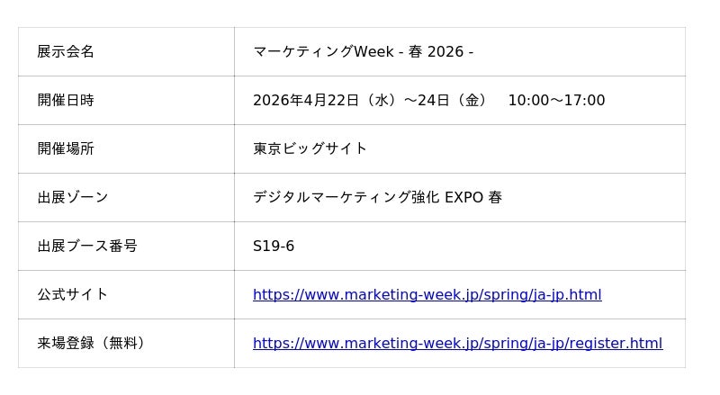 LINEマーケティングツール「Mico Engage AI(ミコエンゲージAI)」を提供する株式会社Mico(本社:大阪市北区、代表取締役社長:山田 修)は、2026年4月22日(水)~24日(金)の3日間、東京ビッグサイトで開催される「マーケティングWeek - 春 2026 -」(デジタルマーケティング強化 EXPO 春)に出展いたします。