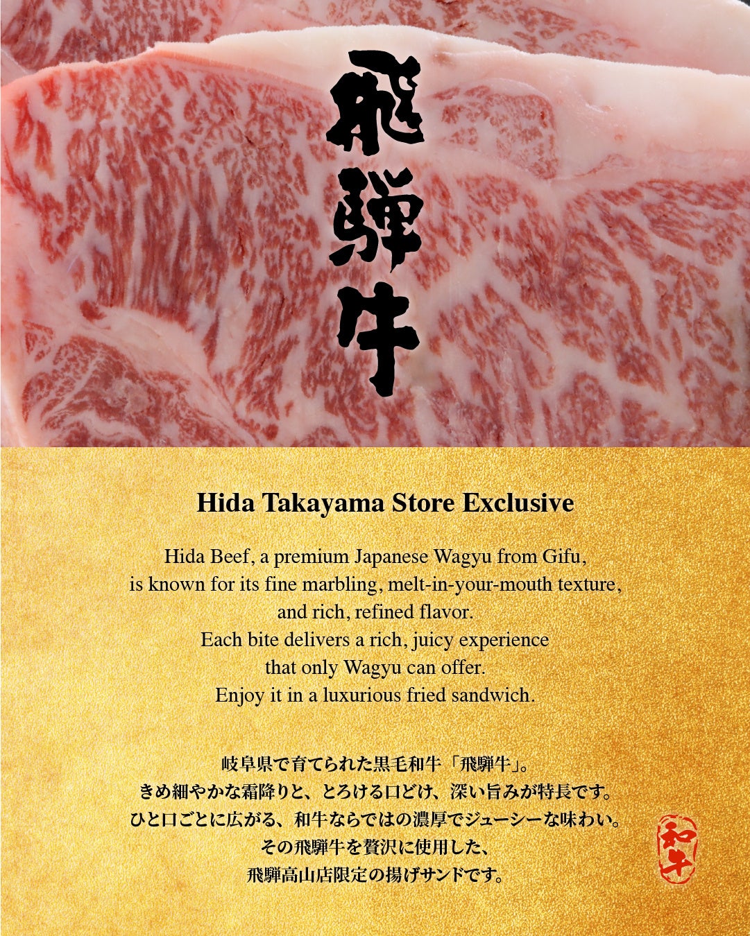 [画像3: https://prcdn.freetls.fastly.net/release_image/107332/82/107332-82-4ef0c2939fbf1b883050dd059aa8b61b-1081x1350.jpg?width=536&quality=85%2C75&format=jpeg&auto=webp&fit=bounds&bg-color=fff ]岐阜県で育てられた黒毛和牛「飛騨牛」は、きめ細やかな霜降りと、とろけるような口どけが特長です。和牛ならではの濃厚でジューシーな味わいを、飛騨高山でしか食べられない揚げサンドで体験できます。