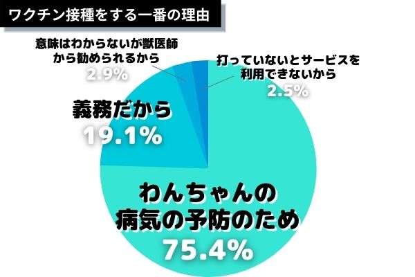 ワクチン接種をする理由で最も多い回答は「わんちゃんの病気の予防のため」75.4%。ワクチン接種で病気を予防することで、大切な愛犬にはいつまでも健康で元気に過ごして欲しいといった、わんちゃんの健康に対する意識が高いことがうかがえる結果となった。