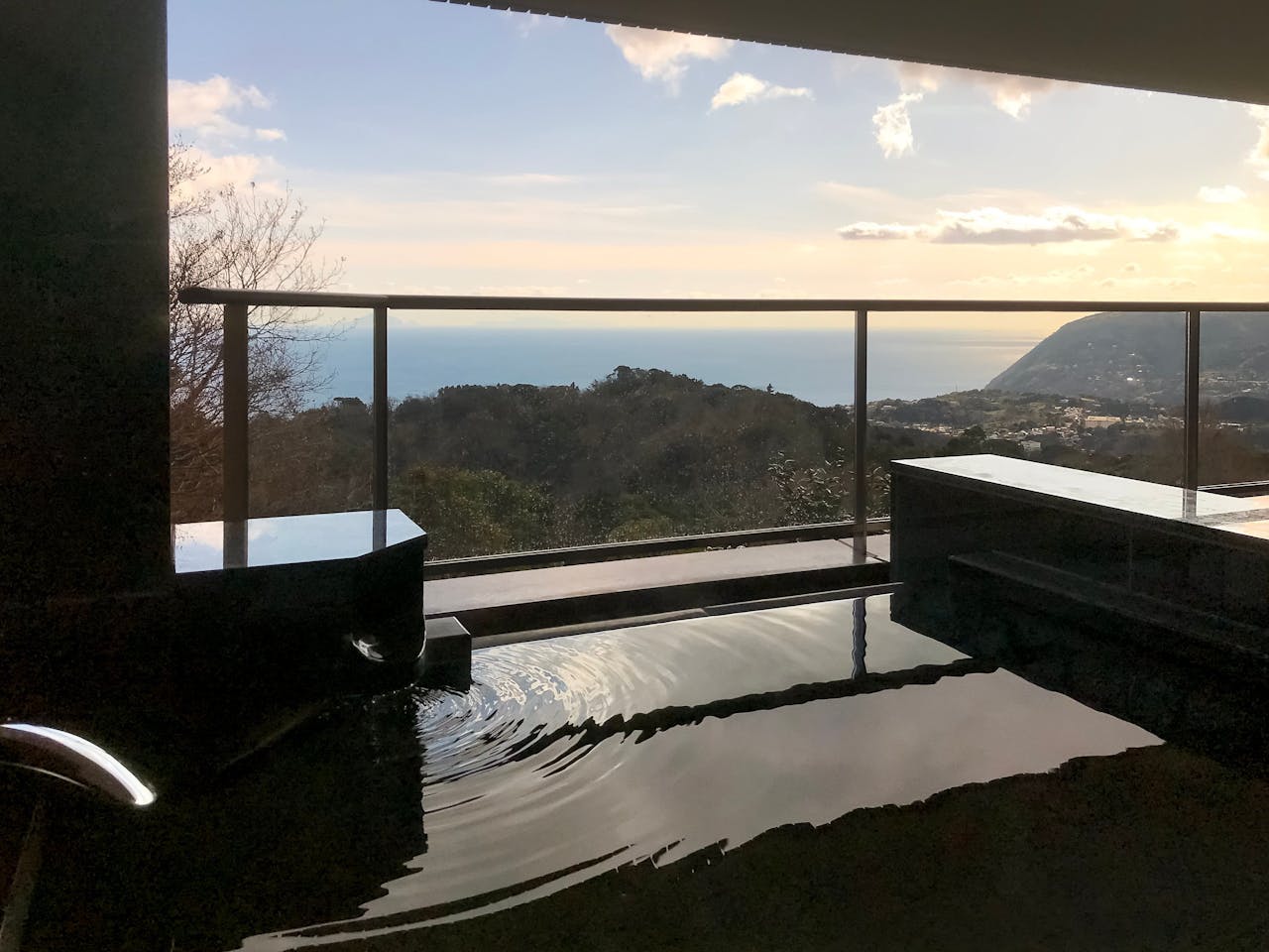 2020年6月、東伊豆の熱川温泉にオープンしたリゾートホテル、伊豆ホテル リゾート&スパ。客室の温泉露天風呂とテラスは、すべてオーシャンビューになっており、太平洋と伊豆諸島を眺望できます。泉質は、保温効果の高い塩化物・硫酸塩温泉。