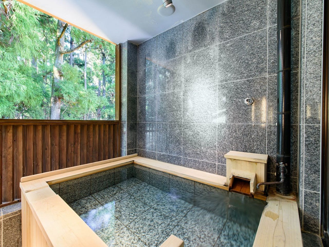 大正時代に三井財閥の別荘として造られた「翠松園」を料亭として、箱根の自然の中に佇む、箱根・翠松園。全23の客室は、源泉かけ流しの露天風呂を完備したスイートルームで、すべてデザインや間取りが異なります。泉質は、肌にやさしい弱アルカリ性の単純温泉。
