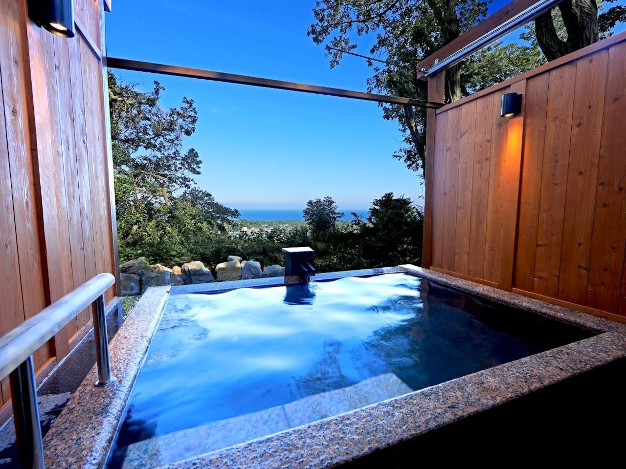 静岡県相模灘に面し、南国リゾートを彷彿させる「熱海後楽園ホテル」は、すべての客室がオーシャンビュー。エクセレンシィフロア(15階から17階)の宿泊客のみ利用できる3つの貸切風呂も、熱海の海と100万ドルの夜景を一望できます。