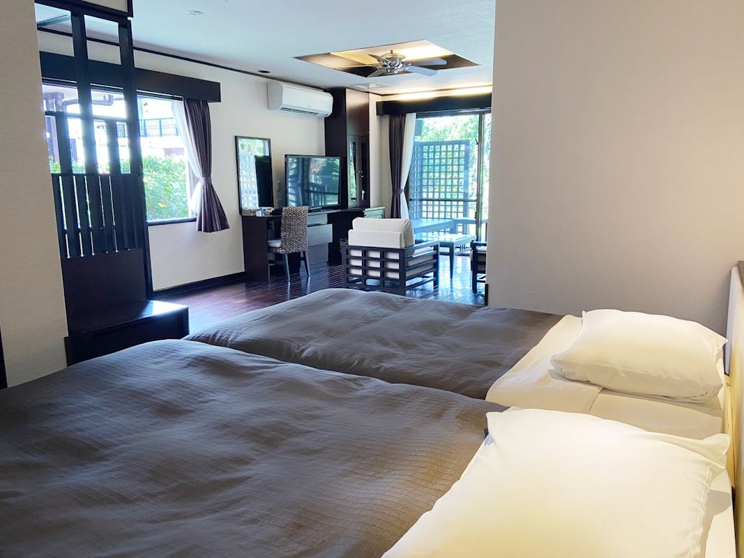 | ペット | 可 ガーデンヴィラの中にワンちゃんルーム3部屋あり。 犬のみ。(1室2匹まで) ※ワンちゃんルーム利用の場合は、誓約書(ホテルホームページより確認)と予防接種証明書コピーを必ず持参。 |