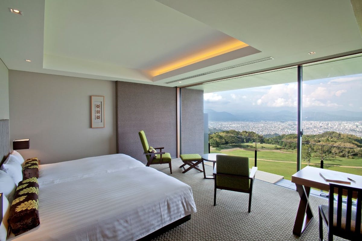 静岡県清水市に位置する「日本平ホテル」は、日本観光地百選1位の景勝地・日本平で半世紀以上の歴史を持つ老舗ホテル。床から天井までガラス張りのホテル内部からは、一日のうちで表情を変える富士山と駿河湾を一望できます。芝生が広がる庭園は富士山を見ながらの散策におすすめ。美術館のようなホテルステイを楽しめます。