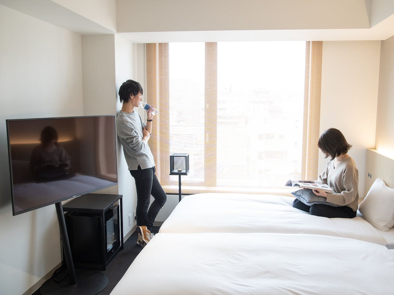 京都市営地下鉄烏丸線の五条駅から徒歩3分の好立地にある「sequence KYOTO GOJO」。こちらのホテルでは、タブレット端末を使用したセルフチェックインや顔認証のルームキー、キャッシュレス決済などの次世代的なシステムを採用しており、ホテル到着後スムーズに部屋まで向かうことができます。館内デザインもスタイリッシュで、特にスマートに旅をしたい若い世代の方に人気の宿です。