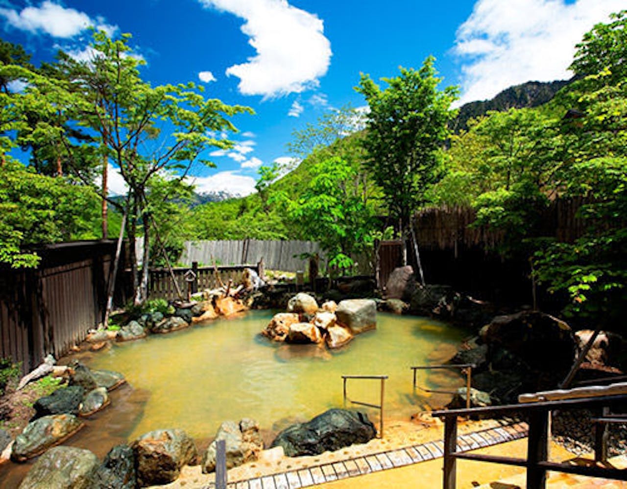 岐阜県奥飛騨温泉郷、豊かな自然の中に佇む「匠の宿 深山桜庵(共立リゾート)。飛騨の民家を参考に天然木を使用した温かみのある客室と、肌触りのやわらかい泉質を持つ源泉かけ流しの温泉が自慢の宿です。大浴場には、湯上がり用ドリンクの無料提供も。