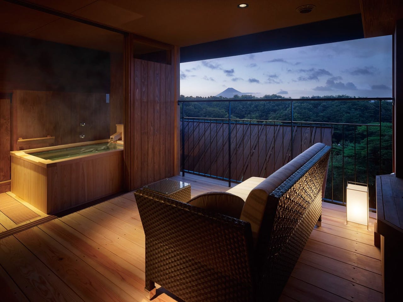 約50万坪もの広大な敷地を誇るリゾート「ラフォーレ修善寺」内にある、ホテルラフォーレ修善寺 山紫水明。全室に富士ひのきと十和田石を使った露天風呂が備えられ、富士山の眺望と疲労回復や神経痛に効果が期待できる修善寺温泉を楽しめます。ひのきの香りが漂うテラスで、やすらぎの時間を過ごしてみては。
