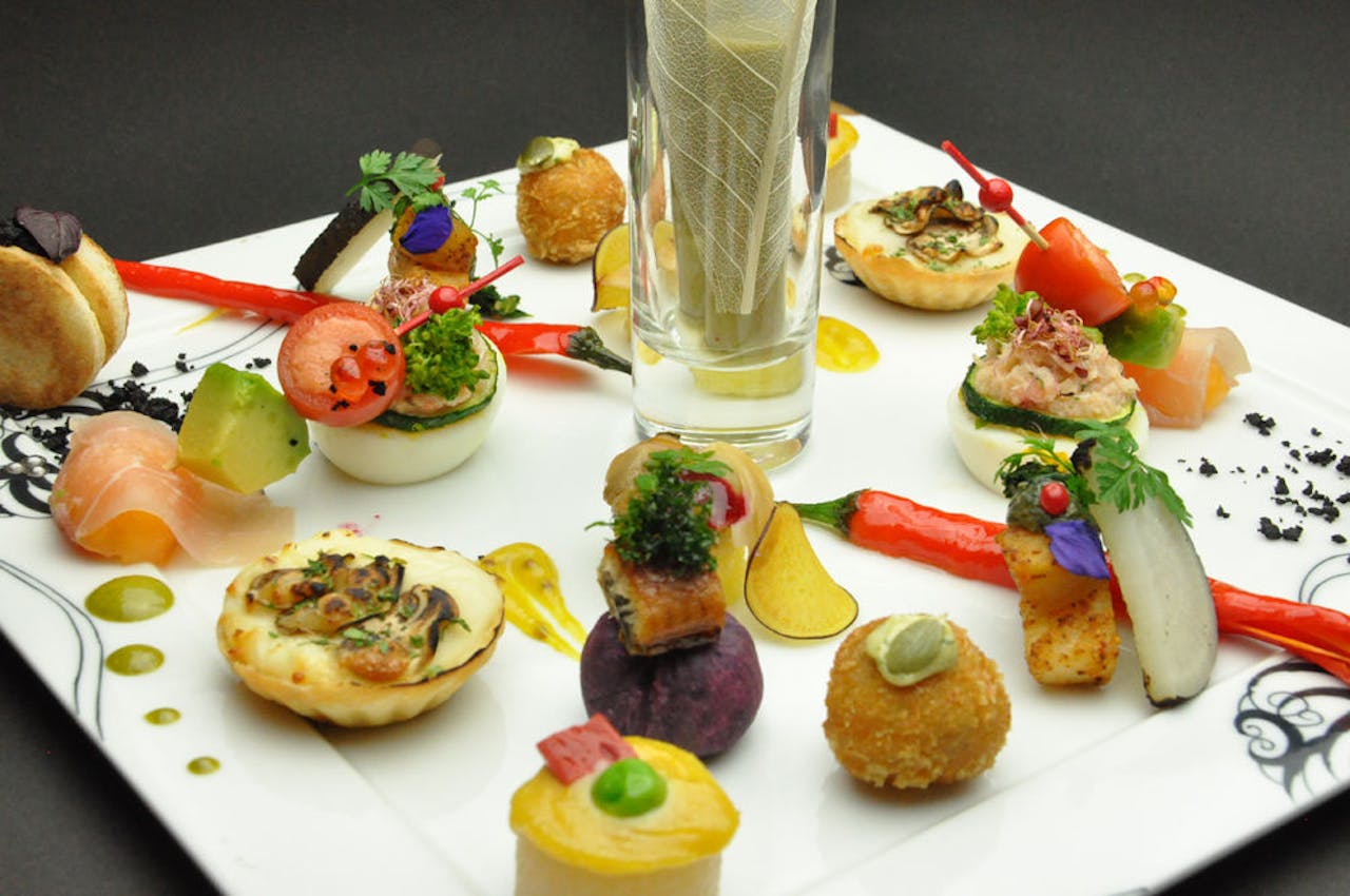 箱根湯本駅から徒歩12分ほどの場所にある、箱根湯本温泉 ホテルマイユクール祥月。スタンダードプランの夕食では、肉料理または魚料理からメイン料理を選択可能。地元の旬の食材を使用した和洋折衷の創作料理が楽しめます。特に前菜の盛り合わせは、つい写真を撮りたくなってしまう見た目の華やかさから女性客に好評です。