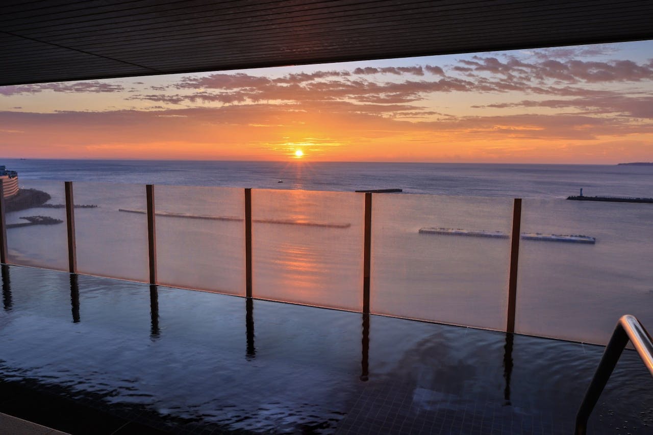 JR熱海駅から車で約7分の場所にある、HOTEL MICURAS(ホテル ミクラス)。大人のシティーリゾートホテルをイメージしたスタイリッシュな館内には、目の前に相模湾を望むオーシャンビューの大浴場があります。敷地内から引いた自家源泉「大月の湯」は、天然の保湿成分・メタケイ酸を多く含む泉質で、美肌効果が期待できます。