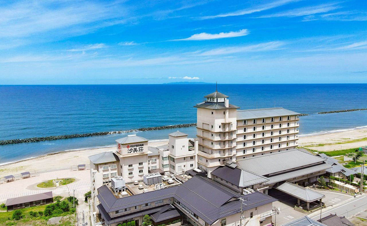 新潟県村上市の日本海沿岸に建つ大江戸温泉物語 汐美荘は、美しい夕景が望める宿です。日本海に面した露天風呂と、2種の貸切風呂は源泉かけ流し。保温効果が高く熱の湯とも言われる瀬波温泉を心ゆくまで堪能できます。