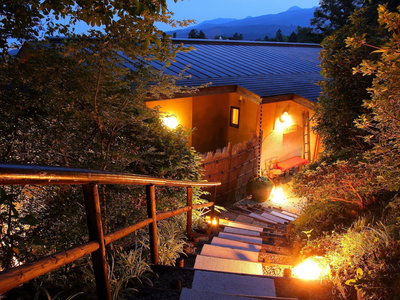 標高800mの高台に位置する、和の宿 華ごころ。こちらの宿は、全8室の客室それぞれの離れに専用の露天風呂が用意されているのが大きな特徴。泊まるたびに、異なった部屋とお風呂の組み合わせを楽しめます。森林に囲まれた露天風呂にはバスローブや椅子も完備され、ビールやシャンパンのデリバリーも可能。ゆったりした時間が過ごせると宿泊客からも好評です。