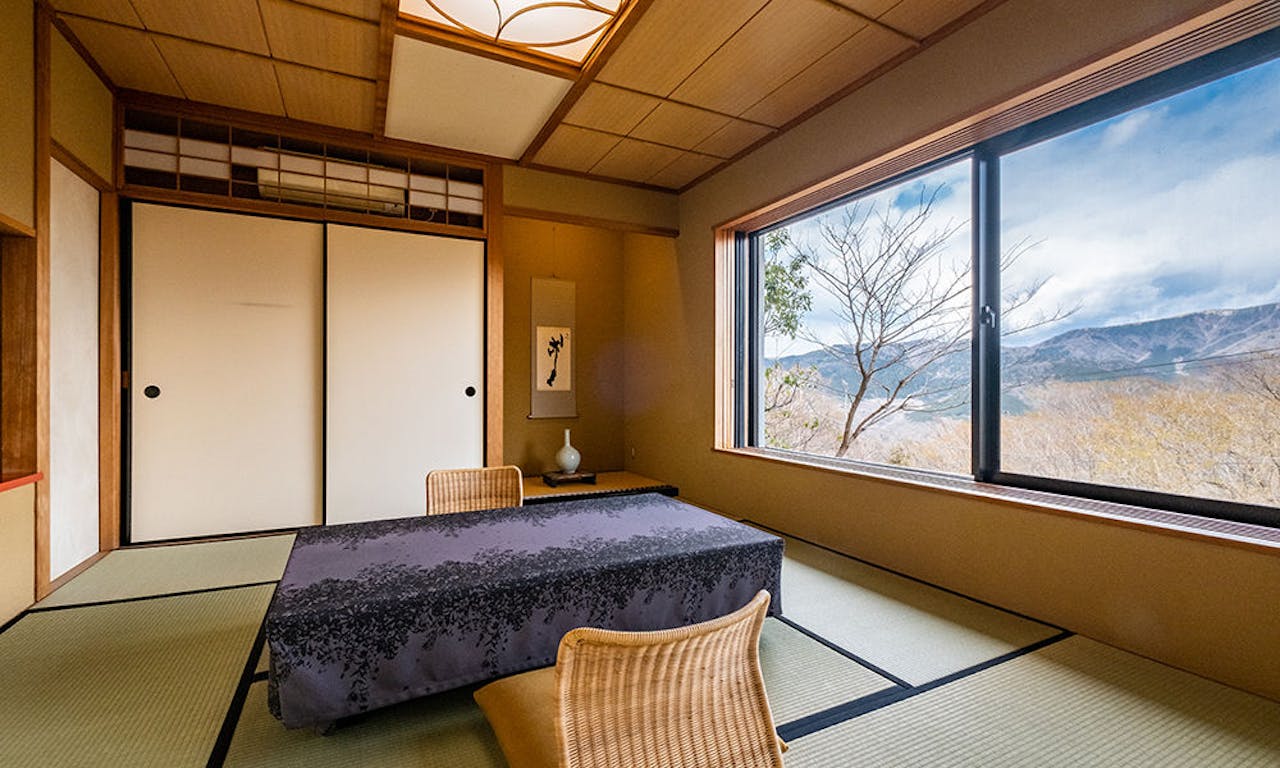 おすすめのプランは「【当館一番人気】「華ごころ」ベーシックプラン/“温泉“と“旬の創作懐石料理“を堪能する1泊2食付き 【離れの専用個室露天風呂付き】外輪山一望の「和室」46平米」、72,273円~(2名、夕朝食付)。