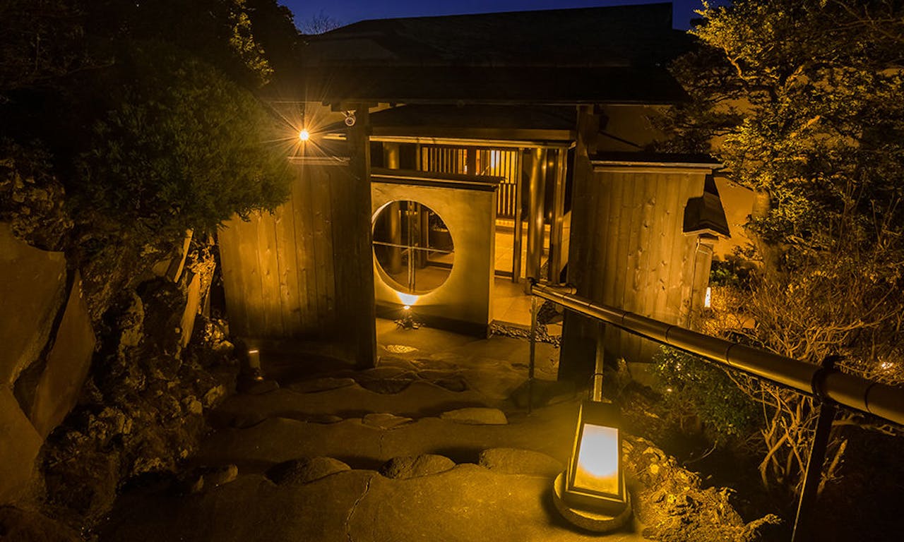 伊豆高原駅から車で10分のところに建つ「絶景の癒しの湯宿 茄子のはな」は、全室露天風呂完備。湯舟からは海と伊豆七島を眼下に望め、夕食は伊豆の三大味覚と言われる「伊勢海老・金目鯛・静岡産ブランドあしたか牛」を使用した和会席が楽しめます。オプションプランとして選べるアロマエステは、女性客から大人気。
