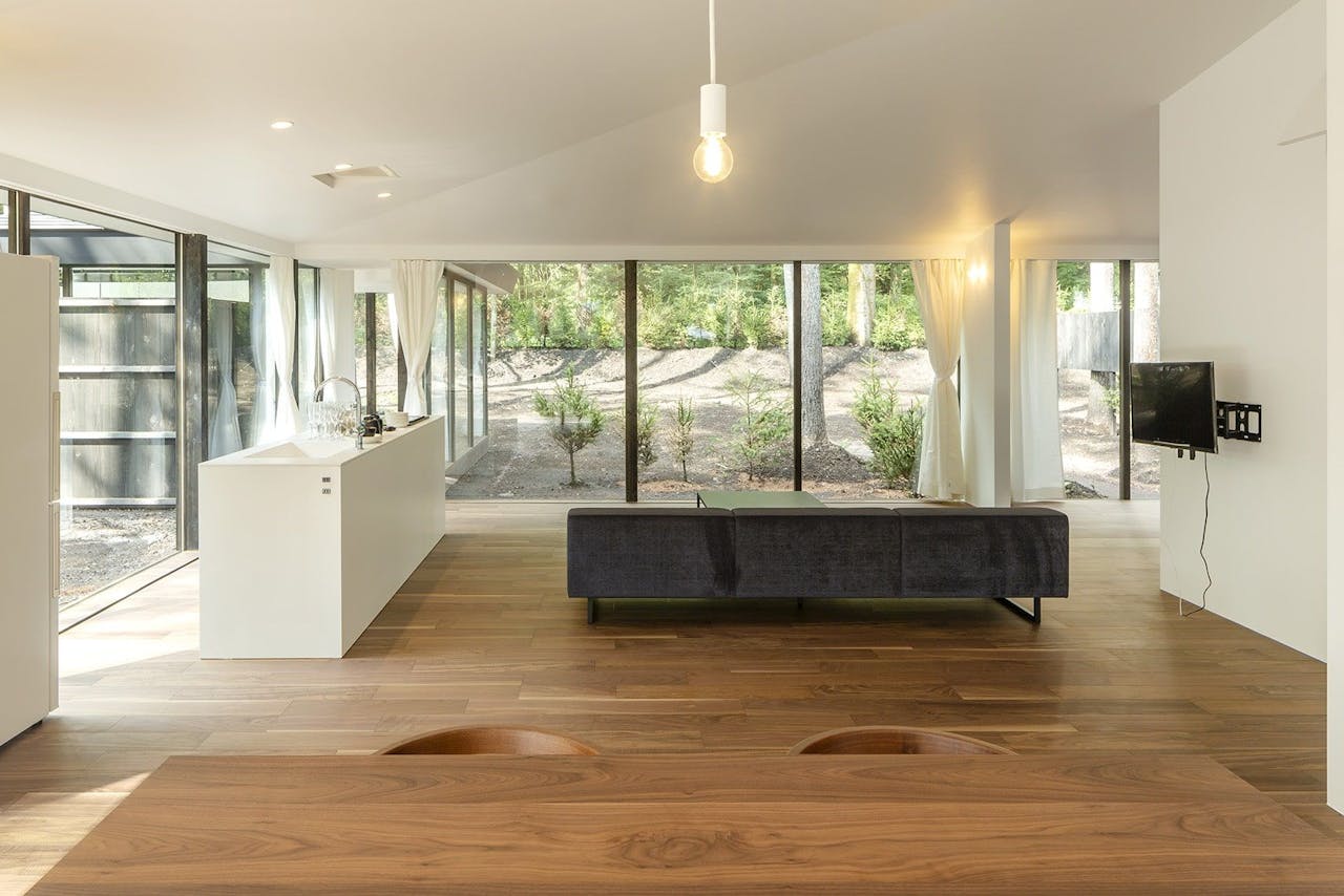 軽井沢駅から車で5分の場所にある、森の離れ。2,600平米の敷地には平屋建てのヴィラが5棟のみ。広々としたヴィラはガラス壁のため、開放感抜群です。リビングやベッドルームにいながら、軽井沢の自然を満喫できます。