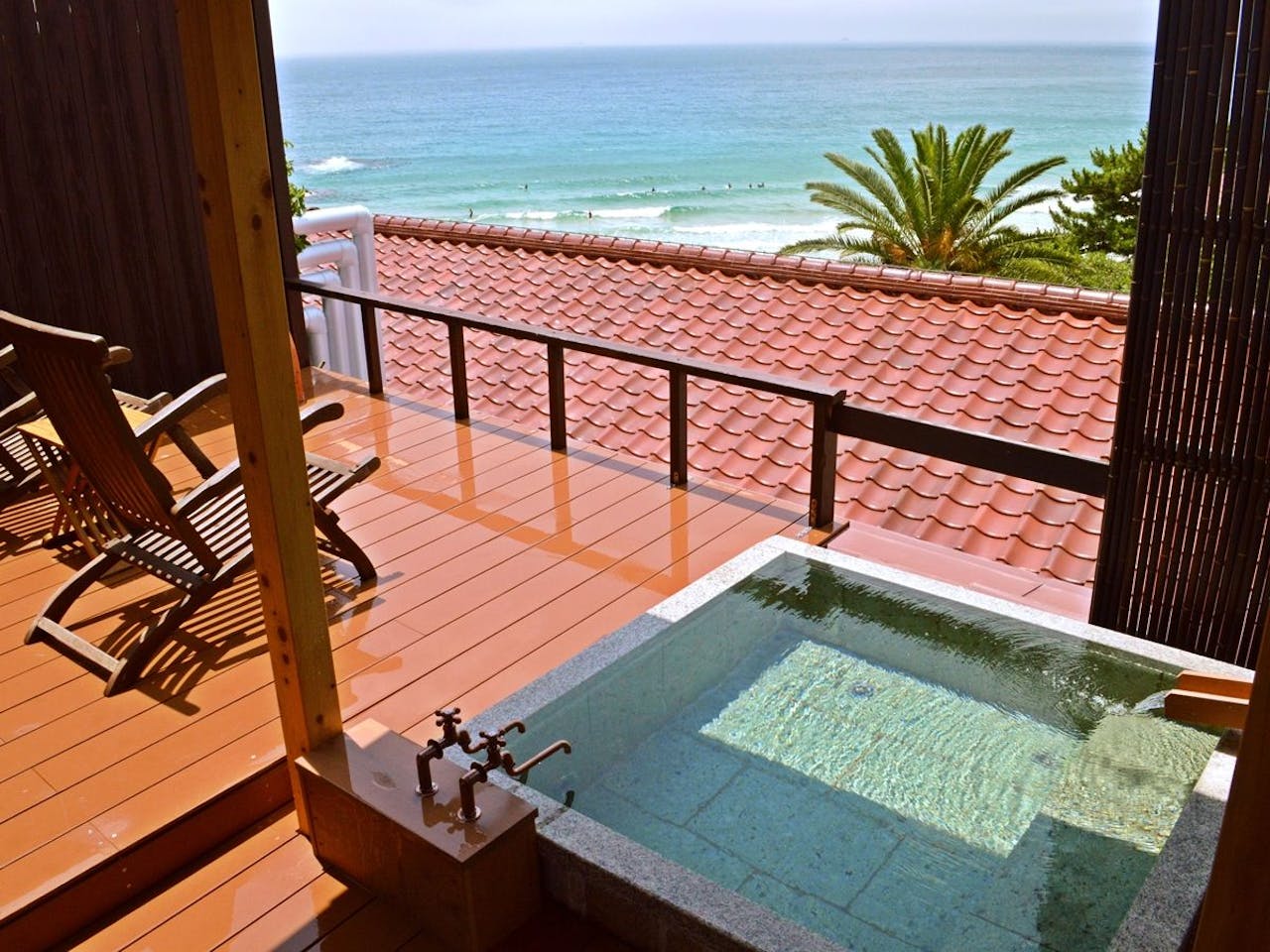 修善寺駅からバスで45分、最寄りバス停・土肥(とい)から徒歩1分の立地に佇む「粋松亭」は、駿河湾に沈む夕日を眺めながら入る展望大浴場と直径190cmの樽風呂を備えた露天風呂付客室が自慢の温泉旅館。部屋食で味わう創作料理は、駿河湾の海の幸を贅沢に使用しています。カップル利用で1名分が半額になるプランは要チェック。