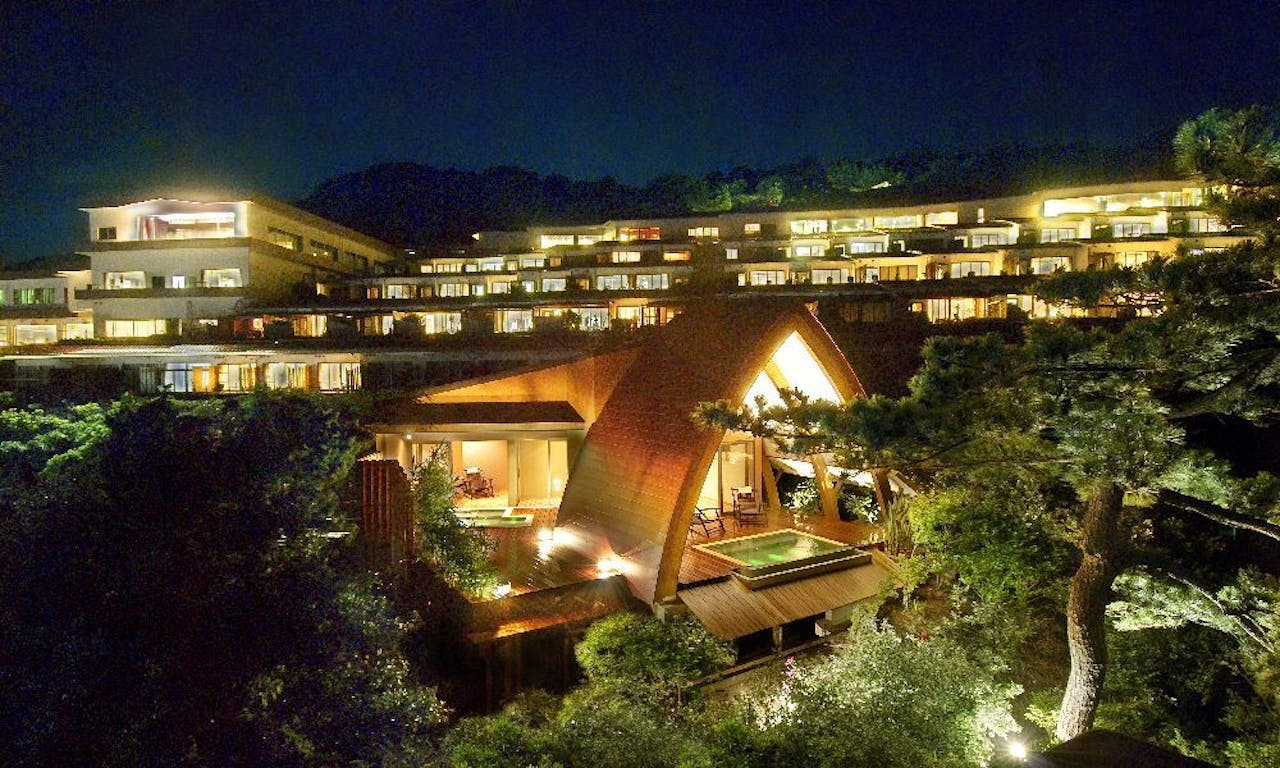 伊豆急下田駅から車で5分の立地に佇む「伊豆下田温泉 下田大和館」は、白砂の砂浜を見下ろす山頂露天風呂と全室オーシャンビューの客室が自慢の温泉旅館。夜はライトアップされる貸切露天風呂も人気です。メインの料理を鮑・伊勢海老・金目鯛・牛の4種類から選べるディナープランは、伊豆の旬の食材を堪能できます。