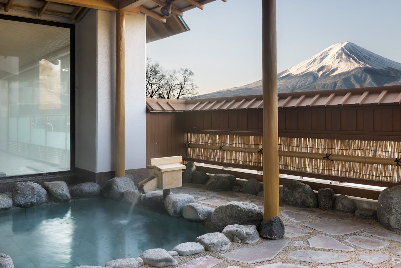 中央自動車道・河口湖ICから車で約10分の場所に佇む、富士河口湖温泉 湖南荘。河口湖の湖畔にあるこちらの宿には、男性大浴場・女性大浴場のそれぞれに美しい富士山を眺める露天風呂が備わっています。館内最上階には、家族や恋人と一緒に楽しめる足湯も完備。富士山と河口湖の絶景を目の前に、きっと会話も弾むはず。