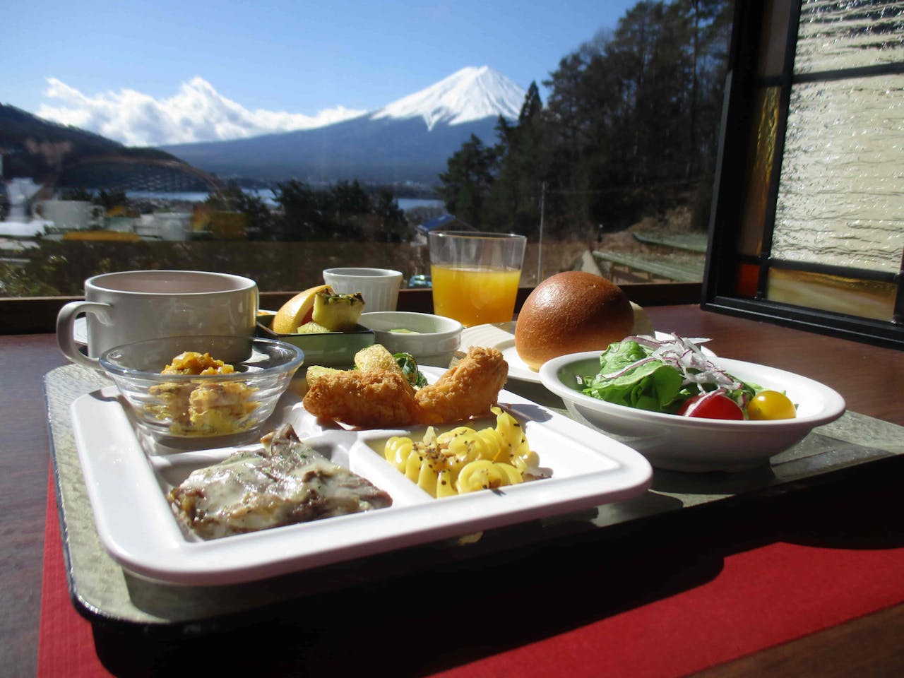 富士急行河口湖駅から車で10分、富士山と河口湖を望む高台に位置する「ラビスタ富士河口湖(共立リゾート)」は、天然温泉の大浴場と旬の幸を使った料理が自慢のリゾートホテル。朝食は地場野菜やフルーツなど60種類以上のメニューがそろう和洋バイキングを楽しめます。館内のいたるところから望める絶景も見逃せません。
