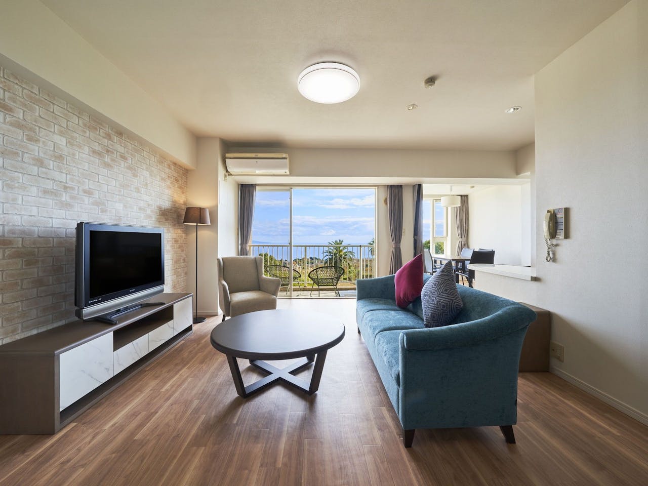 伊豆急行・伊豆高原駅から車で約8分の場所にある「ヴィラージュ伊豆高原」。リビング・ダイニング・キッチンが独立したコンドミニアムタイプの客室は全室スイート仕様。家族旅行でもゆったりと寛げる空間です。すべての部屋からは太平洋を眺めることができるため、リゾート気分を存分に味わうことができます。子どもに人気のメニューも揃えたブッフェスタイルの食事も人気。