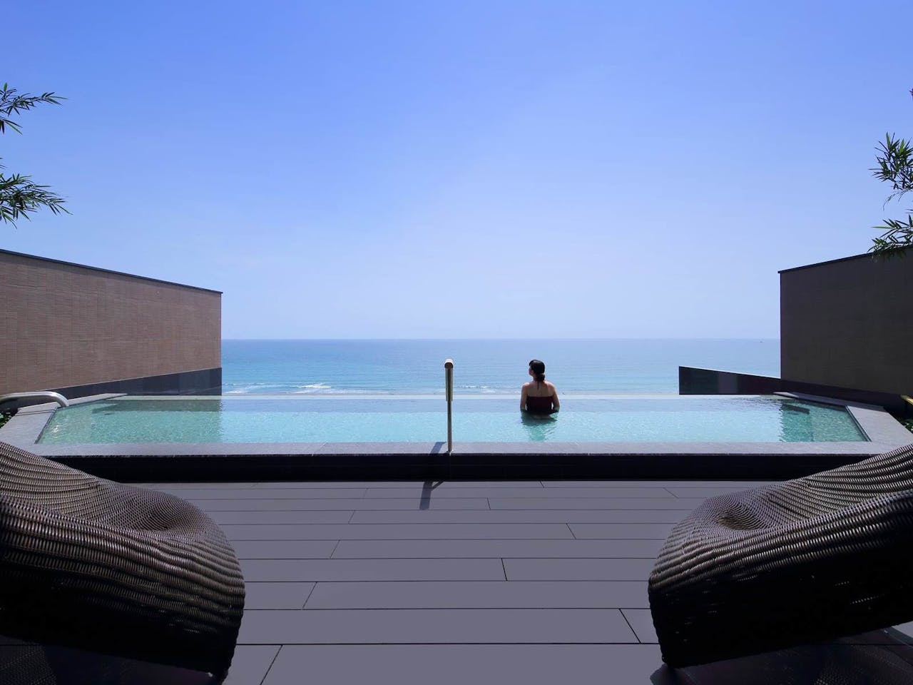 JR外房線安房鴨川駅から車で5分の場所に佇む、数奇屋造りの宿「鴨川館」。泉質の異なる2種類の鴨川温泉を満喫できます。大浴場には自家源泉”潮騒の湯”、屋上の温泉プールと新客室には里山で湧き出る”なぎさの湯”を引湯。インフィニティ仕様の温水プールは、目の前に太平洋が広がり、非日常感を味わえます。