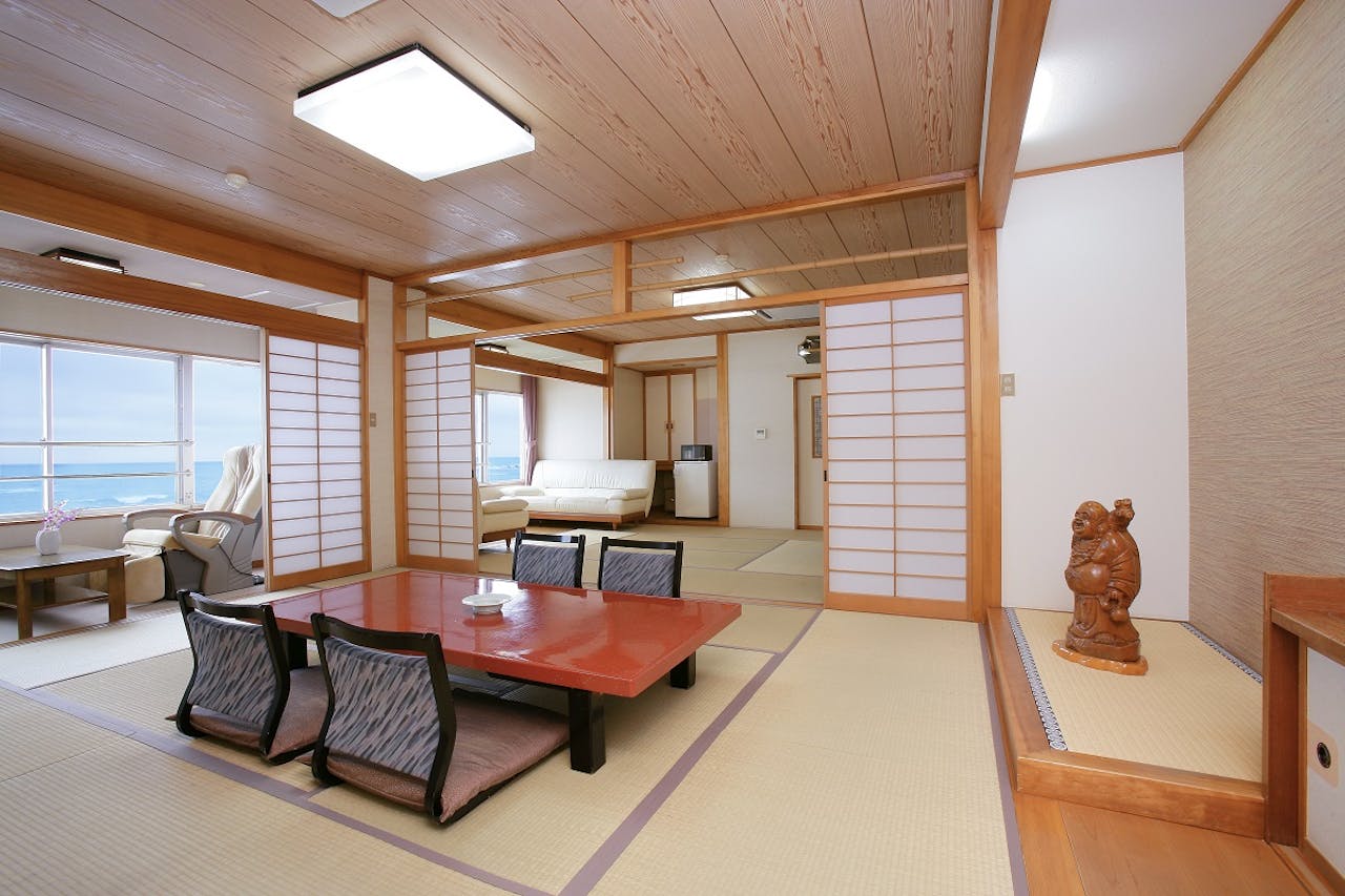 おすすめプランは「【ご朝食付き】チェックイン22時まで!健康・和御膳で朝の活力を「1泊朝食付きプラン」 【和室二間】太平洋一望の海側客室」、25,047円~、(2名、朝食付)。