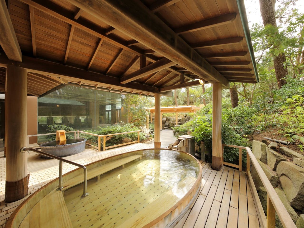 | お風呂 | ■大浴場の数:2 ■営業時間:11:00~01:00 ■温泉:あり ■かけ流し:なし ■にごり湯:なし ■補足事項:加温、加水 ■ご利用時間 午前11時~午前1時/午前5時~午前9時30分 ※チェックアウト後の日帰り入浴のお客様に関しては料金割引がございます。 ■露天風呂の数:2 ※チェックアウト後の日帰り入浴のお客様に関しては料金割引がございます。 ■貸切風呂の数:3 松林側露天風呂「紅殻(べんがら)の湯」 |