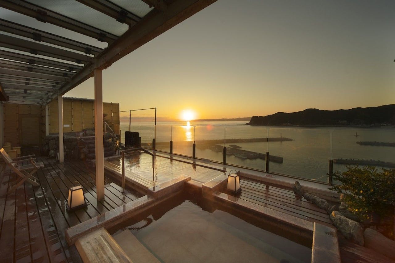 JR外房線・安房小湊駅から車で約5分の場所にある「満ちてくる心の宿 吉夢」は、プロが選ぶ日本のホテル・旅館100選や、夕陽の見える宿100選にも選出されたことのある温泉旅館です。大浴場や、地上35mの天空庭園露天風呂では、時間帯によって違った表情を見せる太平洋を間近に望みながら温泉入浴が楽しめます。房総の旬の海の幸を使った会席料理も絶品。