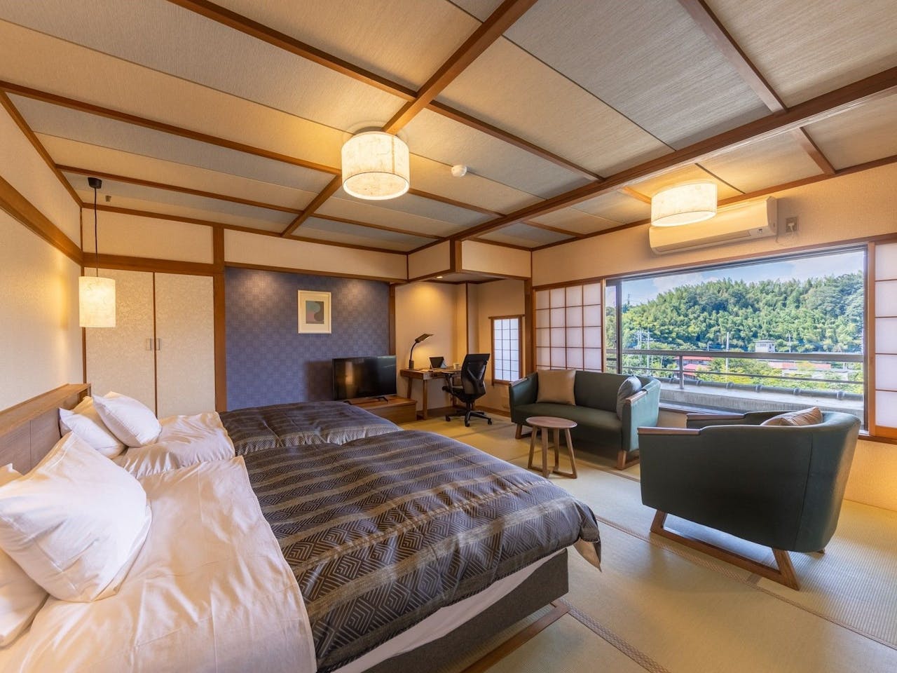 おすすめのプランは「1番人気!【スタンダードプラン】旬の群馬食材満載の”上州牛すき焼き”と新鮮な海の幸”アワビ踊り焼き” <禁煙>新客室-ラクスイ-禁煙和洋室にシモンズツインベッド」、39,292円~(2名、夕朝食付)。
