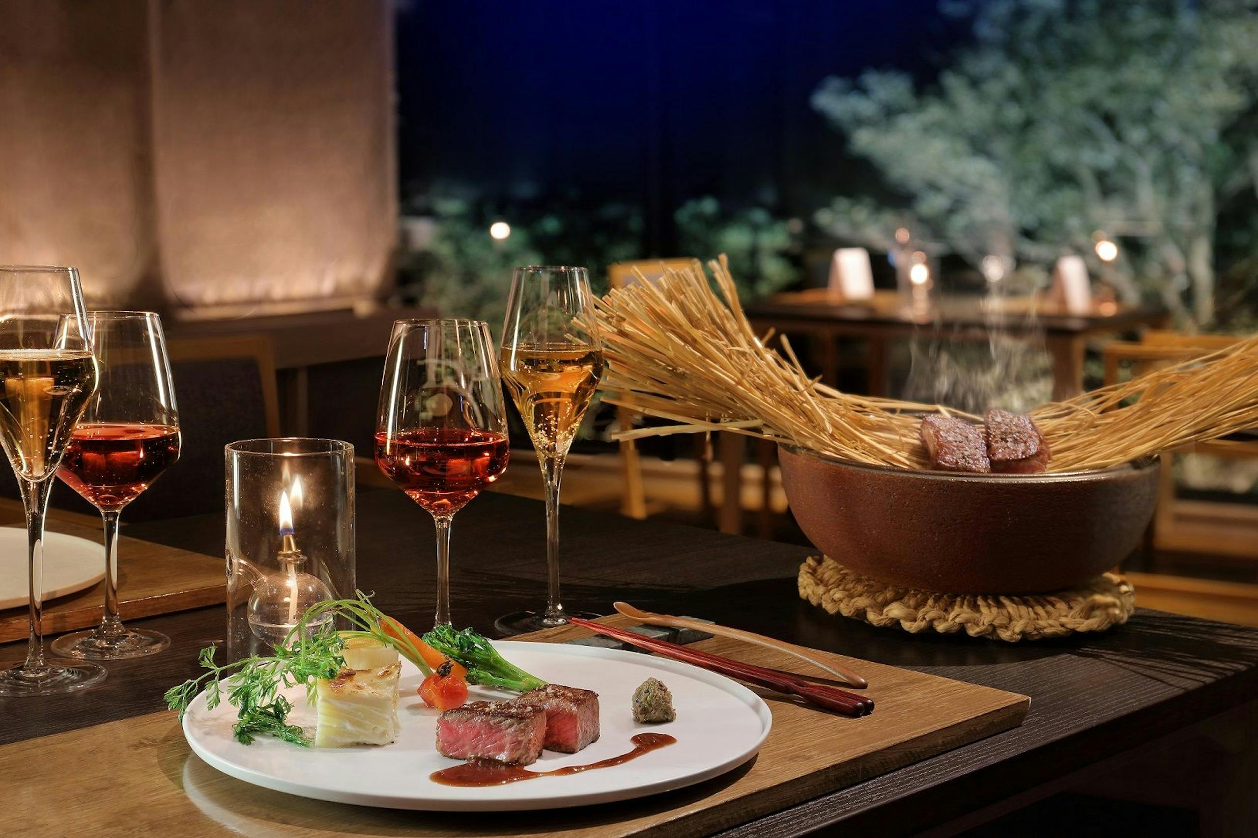 千葉県館山市にある、THE SHINRA 森羅。地産地消をテーマにしたレストランでは、山と海どちらの幸もそろった南房総ならではの食材を使った料理を堪能できます。夕食は創作コース料理、朝食は和食膳または洋食膳から選べるのも魅力です。