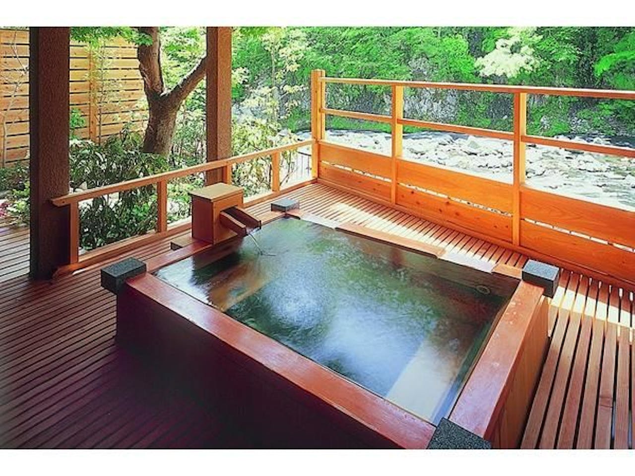 JR那須塩原駅よりバスで約60分、箒川の渓流沿いに佇む「湯ったりの宿 松楓楼 松屋」は、明治11年創業の老舗温泉旅館。本館と別邸六花の2棟からなり、趣の異なる11の露天風呂付き客室を備えています。部屋のお風呂は、すべて源泉かけ流し。広々した室内で温泉と食事を楽しめる部屋食プランが人気です。