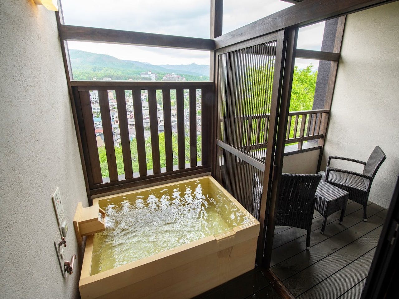 JR長野原草津口駅よりバスで約30分、草津温泉の高台に佇む「ラビスタ草津ヒルズ(共立リゾート)」は、全室露天風呂付きの客室が自慢のリゾートホテル。最上階の展望露天風呂と眺望ラウンジからは、草津の山並みを一望できます。無料のドリンクやアルコール、アメニティバイキングを提供するラウンジサービスも人気です。